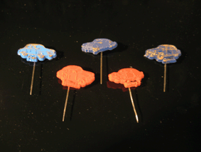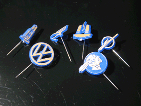 Punaiset ja siniset eri autonmerkkejä esittelevät neulamerkit, painatus osittain samat kuin Hellaksen Auto-sarjassa.
